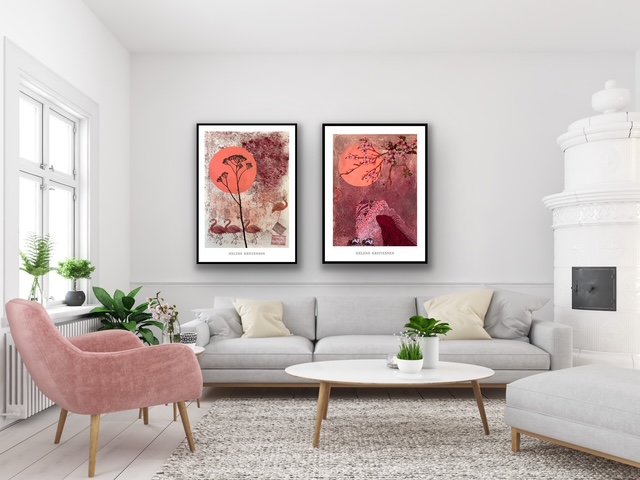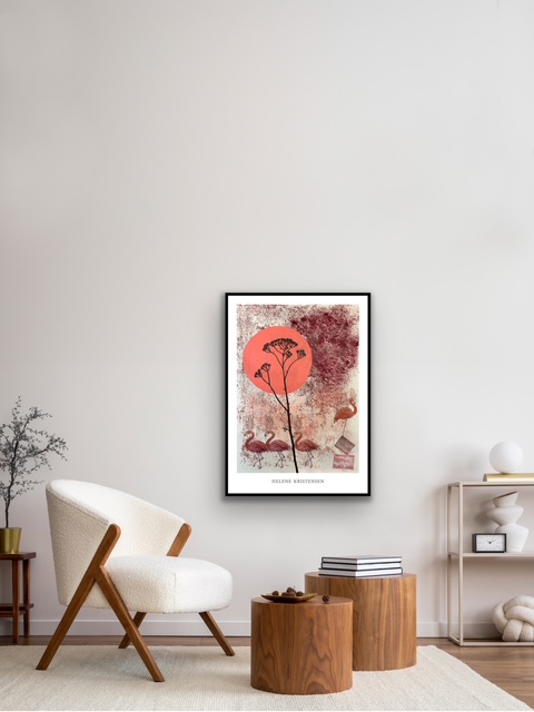 Lad dig forføre af den lette, elegante stemning i Helene Kristensens smukke plakat Flamingoes. Med sine bløde farver og sanselige streger indfanger kunstneren et øjeblik af stilhed og ynde – som et glimt af solnedgangen over et stille vand, hvor flamingoerne står som rolige silhuetter mod en drømmende horisont.